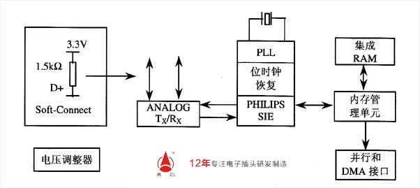 存儲空間管理單元(MMU)和集成RAM:在以12Mb/s的速率傳輸并與ARM相連時,MMU和集成RAM作為USB之間速度差異的緩沖區(qū)。這∷就允許ARM以它自己的速率對USB信息包進行讀寫。