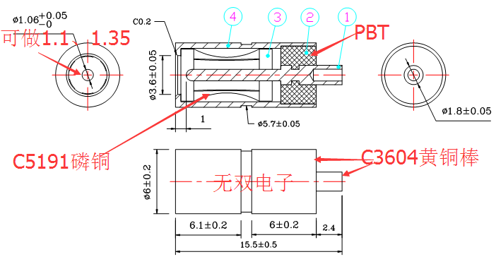 材 質(zhì):外管及中心針式:C3604快削黃銅棒,彈圈:C5191磷青銅,膠料:PBT+15%Pb