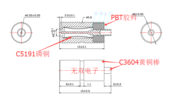 材質(zhì):外管、中心針:C3604黃銅棒;彈圈:C5191磷青銅;膠料:PBT膠料