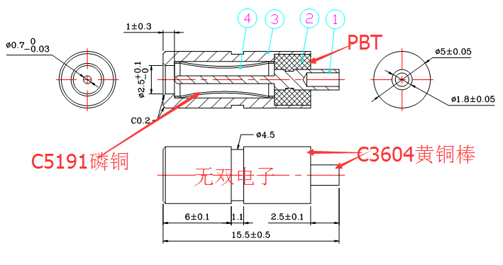 材質(zhì):外管、中心針:C3604黃銅棒;彈圈:C5191磷青銅;膠料:PBT膠料