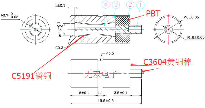 材質(zhì):外管、中心針:C3604黃銅棒;彈圈:C5191磷青銅;膠料:PBT膠料