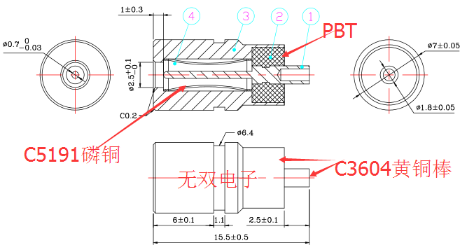 材質(zhì):外管、中心針:C3604黃銅棒;彈圈:C5191磷青銅;膠料:PBT膠料
