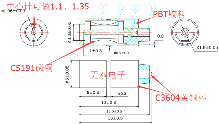 產(chǎn)品描述:銅管內(nèi)徑=3.5mm,中心針=1.1/1.35mm,銅管外徑=6.0mm,;黑膠/黃膠及其它顏色,鍍層為鍍鎳.