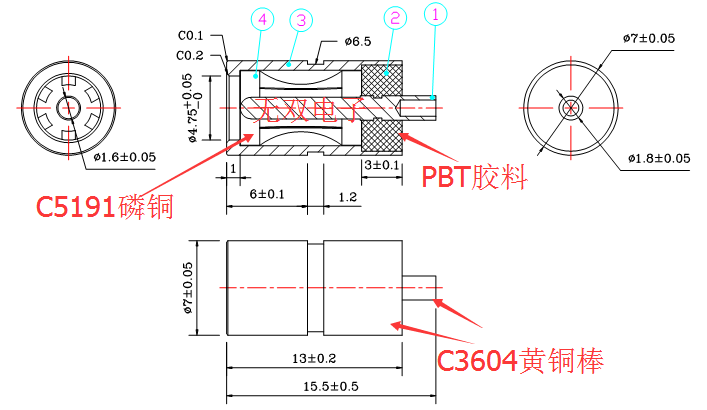 材 質(zhì):外管及中心針式:C3604快削黃銅棒,彈圈:C5191磷青銅,膠料:PBT+15%Pb