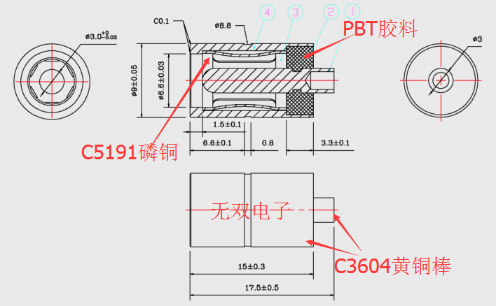 材 質(zhì):外管及中心針式:C3604快削黃銅棒,彈圈:C5191磷青銅,膠料:PBT+15%Pb