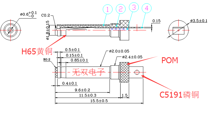 材 質(zhì):外管:C3604快削黃銅棒,端子:C5191磷青銅,膠料:臺灣寶理POM料