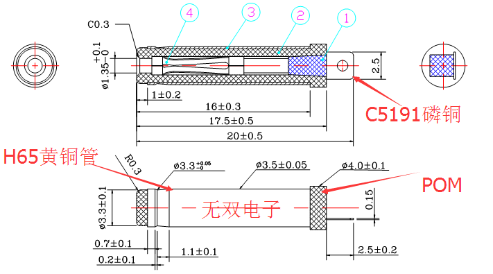 材 質:外管:H65黃銅管,端子:C5191磷青銅,膠料:臺灣寶理POM料