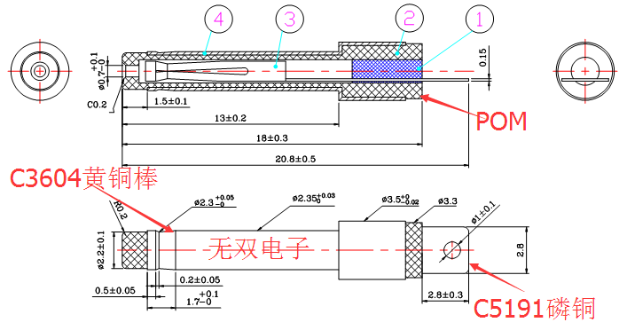 材 質(zhì):外管:C3604黃銅棒,端子:C5191磷青銅,膠料:臺(tái)灣寶理POM料