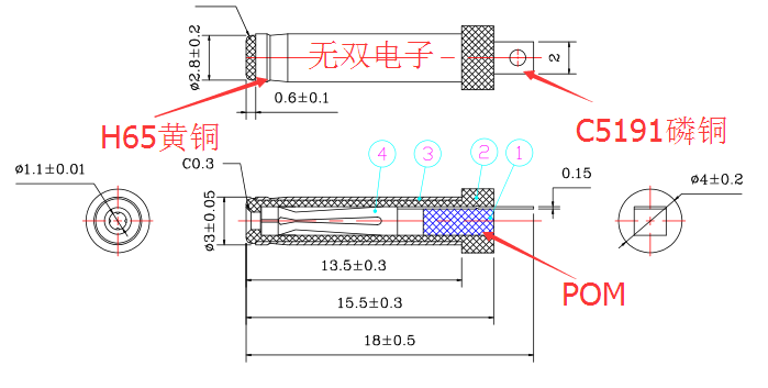 材 質(zhì):外管:H65黃銅管,端子:C5191磷青銅,膠料:臺(tái)灣寶理POM料