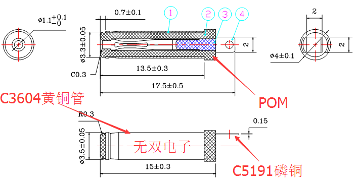 材 質(zhì):外管:H65黃銅管,端子:C5191磷青銅,膠料:臺(tái)灣寶理POM料
