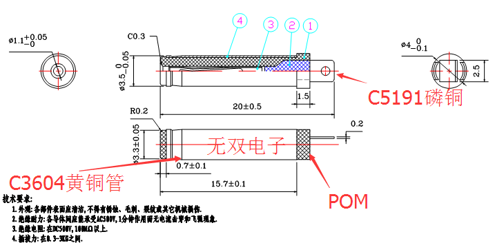 材 質(zhì):外管:H65黃銅管,端子:C5191磷青銅,膠料:臺灣寶理POM料