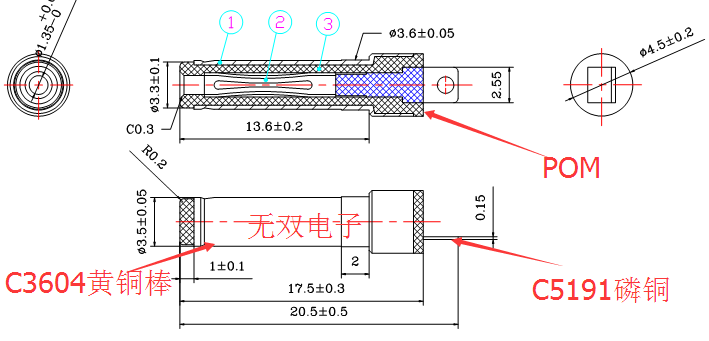 材 質(zhì):外管:C3604黃銅棒,端子:C5191磷青銅,膠料:臺灣寶理POM料