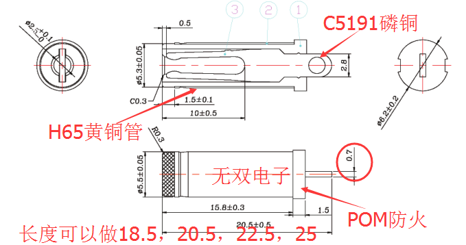 材 質(zhì):外管:H65黃銅管,端子:C5191磷青銅,膠料:PBT防火膠料