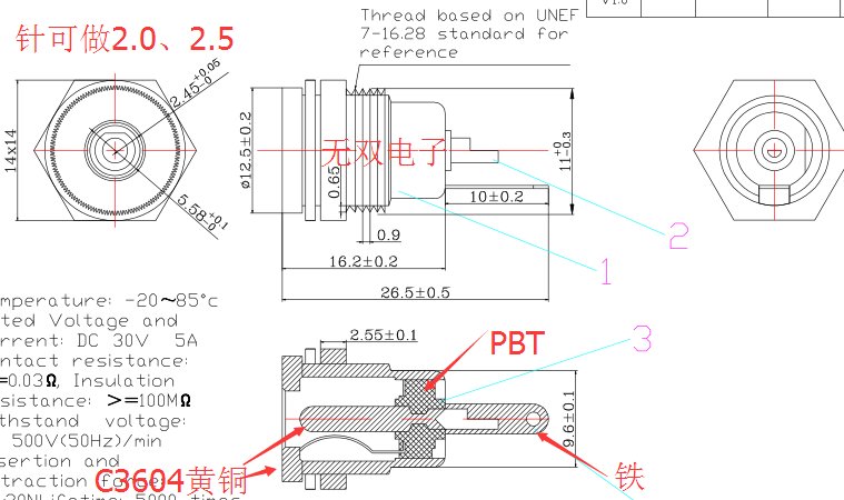 材質(zhì):外管、中心針:C3604黃銅棒;焊片:鐵;膠料:PBT膠料