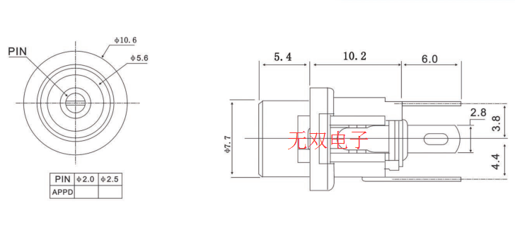 產(chǎn)品描述:內(nèi)徑5.6,針大小2.0/2.5,可以對(duì)插5.5*2.1,5.5*2.5公頭