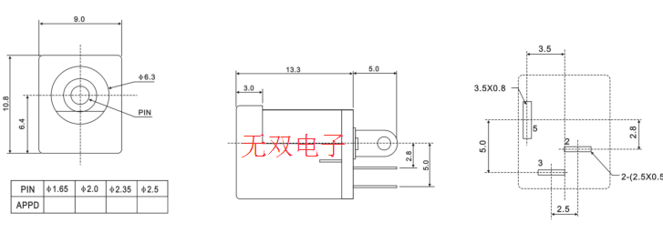 產(chǎn)品描述:內(nèi)徑6.3,針大小1.6/2.0/2.5,可以對(duì)插5.5*1.65,5.5*2.1,5.5*2.5公頭