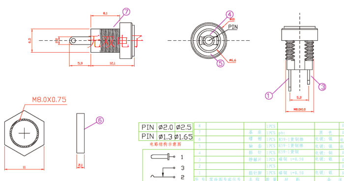 產(chǎn)品描述:內(nèi)徑5.8,針大小1.3/2.0/2.5,可以對插3.5*1.35,5.5*2.1,5.5*2.5公頭