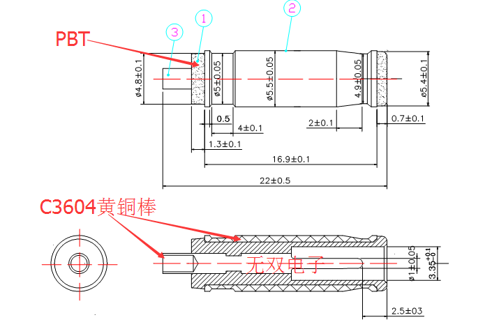 材 質(zhì):外管和中心針:C3604黃銅棒,膠料:PBT+15%Pb