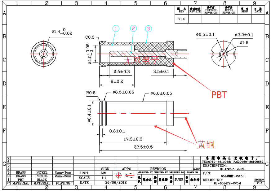 產(chǎn)品描述:6514銅針22.5,OD=6.5mm,OD(PIN)=1.4mm,黑膠/黃膠及其它顏色,鍍層為鎳或金.