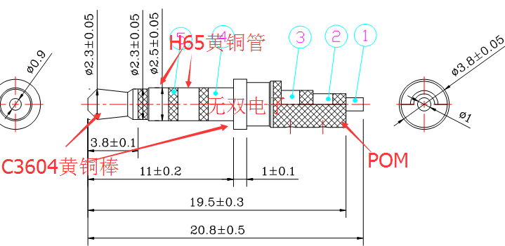 材 質(zhì):一段,四段C3604黃銅,二段,三段:H65黃銅管,膠料:臺灣寶理POM環(huán)保料