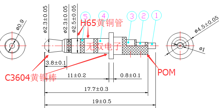 材 質(zhì):一段,四段C3604黃銅,二段,三段:H65黃銅管,膠料:臺(tái)灣寶理POM環(huán)保料