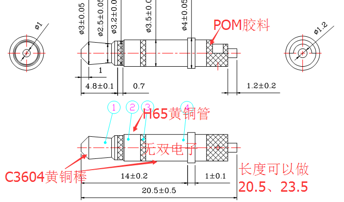 產品描述:3.5*20.5立體聲4.0盤插針,黑膠/白膠及其它顏色,鍍層為鎳或金.