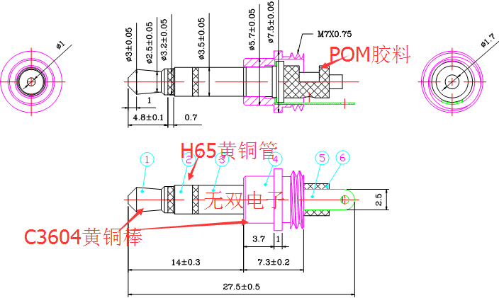 材 質(zhì):一段,三段C3604黃銅,二段H65,膠料:臺(tái)灣寶理POM環(huán)保料