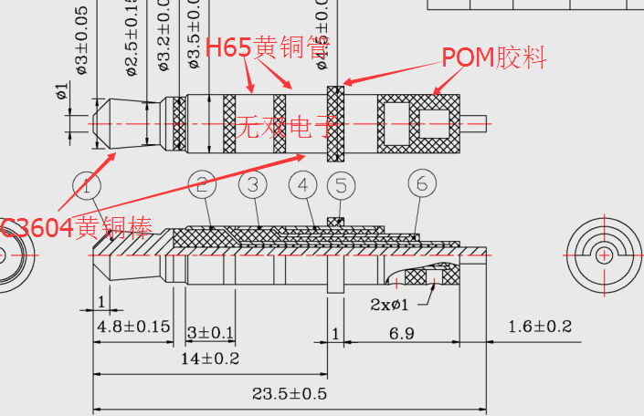 材 質(zhì):一段,四段C3604黃銅,二、三段H65,膠料:臺(tái)灣寶理POM環(huán)保料