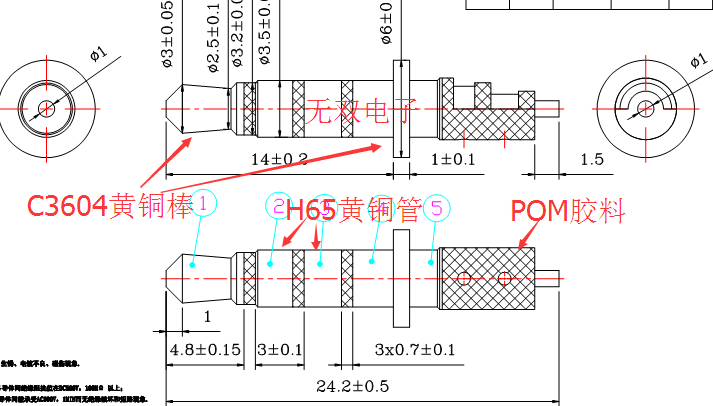 材 質(zhì):一段和四段C3604黃銅,二,三段H65黃銅,膠料:臺灣寶理POM環(huán)保料