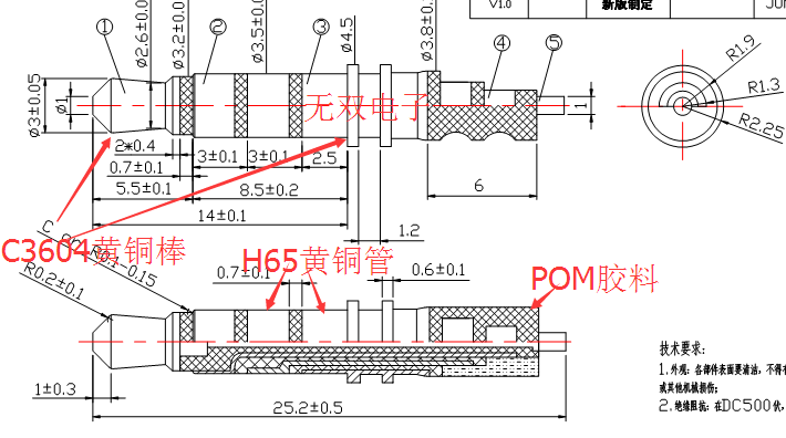 材 質(zhì):一段和四段C3604黃銅,二,三段H65黃銅,膠料:臺灣寶理POM環(huán)保料