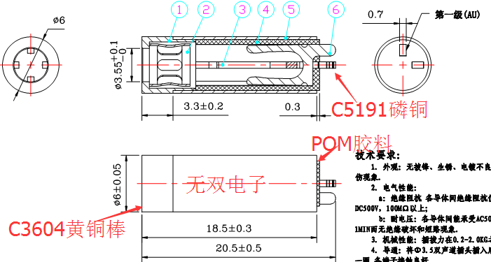 產品描述:3.5*6.0*20.5三極耳機母座,鍍層為鎳或金.