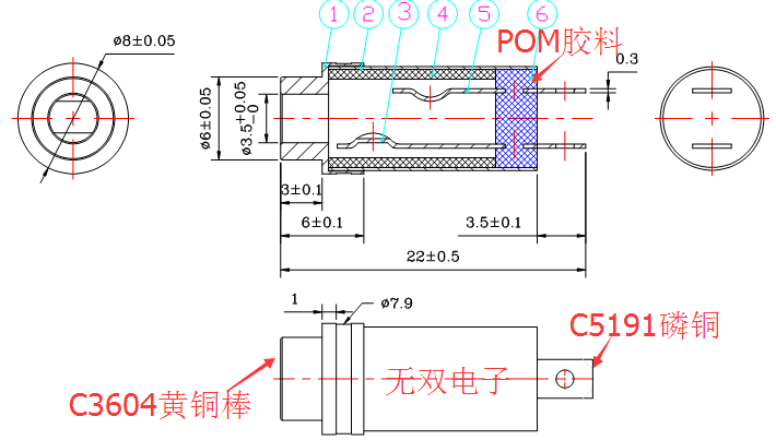 產(chǎn)品描述:3.5*6.0*8.0*22.0三極耳機母座,鍍層為鎳或金.