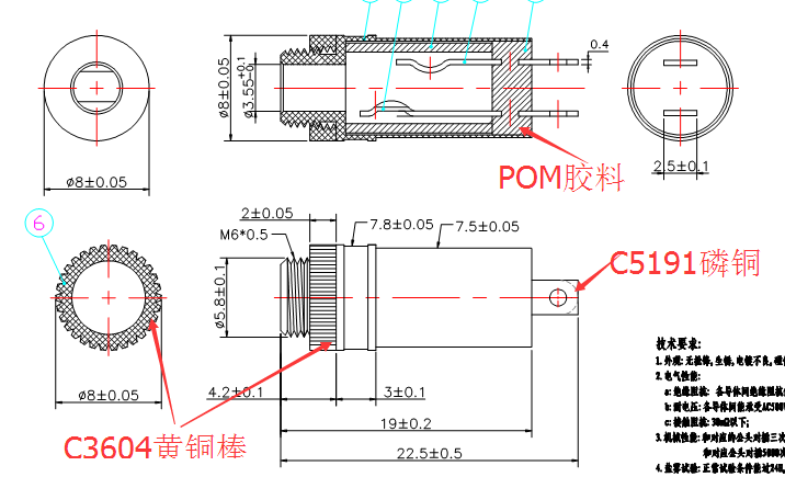 產(chǎn)品描述:3.5*6.0*8.0*22.0帶螺母三極耳機母座,鍍層為鎳或金.