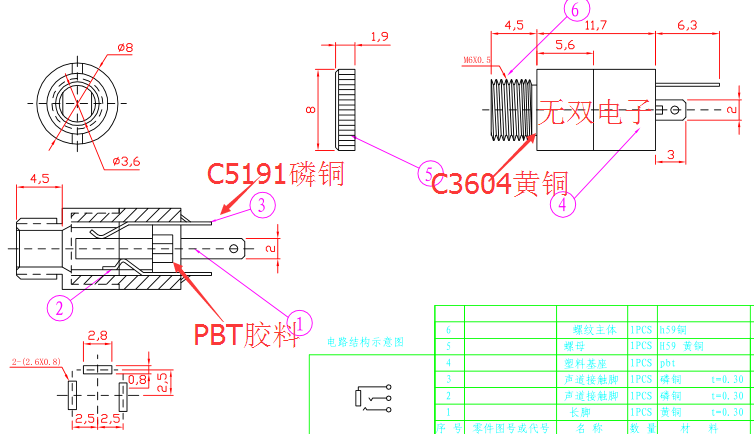 材 質:彈片C5191磷銅,外管H65黃銅,膠料:PBT環(huán)保料