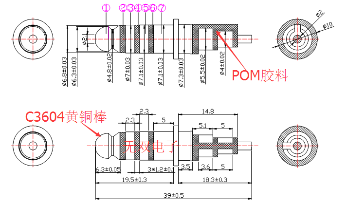 材 質(zhì):一段和三段C3604黃銅,二段H65黃銅,膠料:臺(tái)灣寶理POM環(huán)保料